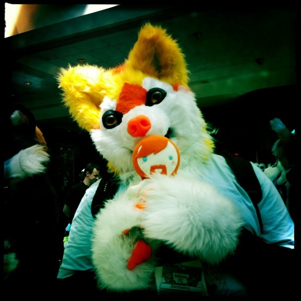 I talked to these guys briefly. How could I resist a skunk in scene-kid shades? Anyway, I asked the one in the middle how they got into the furry phenomenon; he just shrugged and gave me a muffled, “The Internet?” Whiskey over there refused to break character. He just kept cocking his head and resting it on his hands. So fucking adorable, I couldn’t stand it.