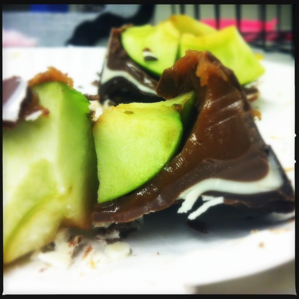 But Gayle had forgotten to bring my present on Monday, and then she forgot yesterday, too! But by then, I already knew it was a chocolate-covered Granny Smith apple. If you’ve been following my apple journey over the last year, you know I’m not a big fan of green apples, but hey — it’s the thought that counts, right?