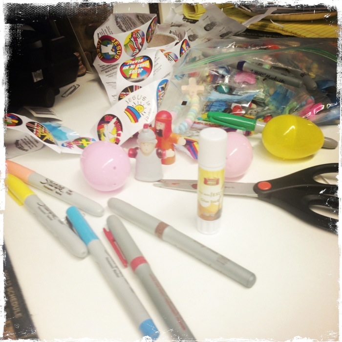I was way more prepared this year though, and even ordered a box of Jesus-y goodness from Oriental Trading, like Christian-themed jelly beans (the red ones symbolize God’s shed blood, y’all), candy bracelets with candy crosses, Jesus stickers and Biblical finger puppets. Oh, what good wholesome fun.
