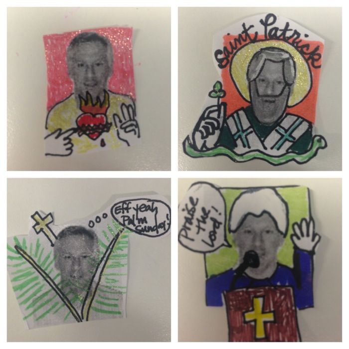 This is what my desk has looked like all week, thanks to Easter Glenn Hunt 2014. If you weren’t around on these blog-parts last Easter, this is basically when I turn Glenn’s employee ID photo into an array of Biblical characters and usually one or two that are tableau-esque. (Last year it was a department-themed Noah’s Ark and the Last Supper.) Then I stuff one into an egg with candy and hide it somewhere around the office and pray that whoever finds it won’t run to HR. I like to live on the edge.