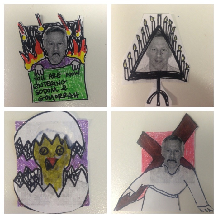 I just smiled bigger and got to work. And by “work” I mean printing out his stupid face to tape onto another stupid face.
