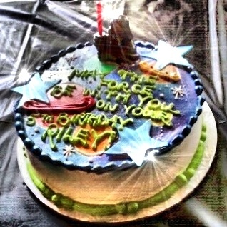 Wait, we also had a cake with a Darth Vader candle. The cake itself was just an outer space theme because I was thoroughly underwhelmed at the picture of the Star Wars cake on the bakery’s website (only bakery I will buy a birthday cake from, I should add). Henry suggested just ordering a sheetcake and then cutting it into the shape of Darth Vader’s mask and then re-frosting it. Yes, because let’s spend $70 dollars on a delicious cake only to shit it up with store-bought frosting. Good thinking, Betty Crocker.